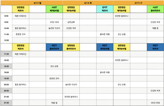 모든 수업은 50분 동안 진행되며, 짧은 시간 안에 유연성, 근력, 바디라인까지 균형 있게 관리할 수 있도록 구성되어 있습니다. 실내에서 쾌적하게 운동할 수 있어 꾸준한 다이어트와 체형 관리에도 효과적입니다.